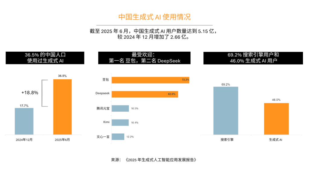 在中国,生成式 AI 用户规模已达 5.15 亿,市场呈现出豆包与 DeepSeek 双头领先的格局。然而,传统搜索引擎仍保有 69.2% 的用户存量,这要求品牌必须实施“双轨并行”的优化策略。