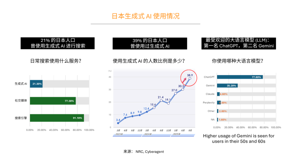 在日本,生成式 AI 已覆盖近四成人口,ChatGPT 凭借 77.6% 的份额稳居首位。目前,21% 的用户已表现出“AI 优先”的搜索习惯,且这种对传统引擎的颠覆在年轻群体中正呈爆发式增长。