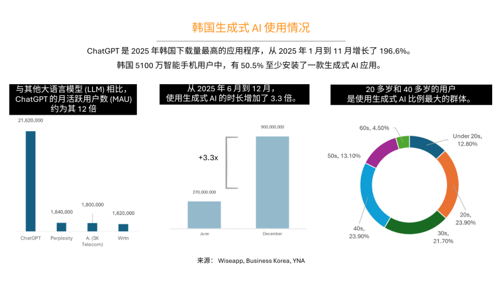 在韩国,ChatGPT 问鼎 2025 年APP下载冠军,前 11 个月涨幅高达 196.6%。伴随生成式 AI 使用量在半年内飙升 3.3 倍,20 岁及 40 岁人群已成为该领域最大的用户群体。